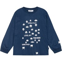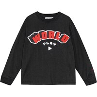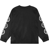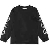 Svart ekologisk bomullströja med långa ärmar, rund hals och ribbad kant vid hals och muddar. Den har en lös passform och en tryckt design som löper längs båda ärmarna med 3 pixlade smiley i vitt.