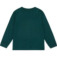 Grön tröja i ekologisk bomull med långa ärmar, rund hals och ribbade muddar. Tröjan har en lös passform och en tryckt bild på framsidan som visar en astronaut i rymden. Du kan se vad han ser, speglat i hans hjälm. Trycket är i nyanser av grönt och rosa.