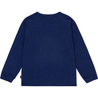 Mörkblå tröja i ekologisk bomull med långa ärmar, rund hals och ribbstickad kant vid hals och ärmslut. Tröjan har en lös passform och en tryckt design på framsidan som visar en scen från ett racingspel, precis när du har vunnit.