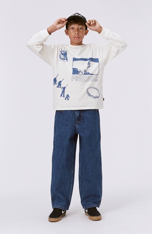 Vit långärmad t-shirt med blått mönster. Detta mönster är inspirerat av skateboard miljön. Här används grafiska element som foton, grafiska streck, symboler och små bitar av text, som tillsammans skapar ett grafiskt collage i två toner. Denna långärmade t-shirt är tilverkad i 100% ekologisk bomull, har rund hals med ribbkant, ribbkant vid ärmslut och höfter, samt en lös passform.
