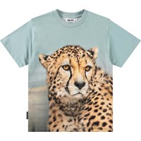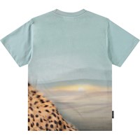 Blå ekologisk bomullst-shirt med korta ärmar och ribbad halsringning. T-shirten har en lös passform med en gepard på framsidan som fortsätter på baksidan.