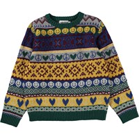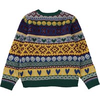 Multifärgad stickad tröja med nordisk inspirerat mönster. Tröjan är i varma och mörka färger och är inspirerad av nordiska stickade traditioner, men med en rolig Molo tvist. Kanske kan du hitta både peacetecken, hjärtan och små smileys om du tittar noga. Denna tröja är tillverkad i en mjuk ullblandning som gör den perfekt till de kalla dagarna. Den har rund hals med ribbstickning, långa ärmar, ribbstickning vid ärmslut och höfter och en normal passform. Om du fryser om öronen kan du enkelt matcha denna tröja med mössorna Kipp eller Kaisu i samma mönster, för den perfekta looken.