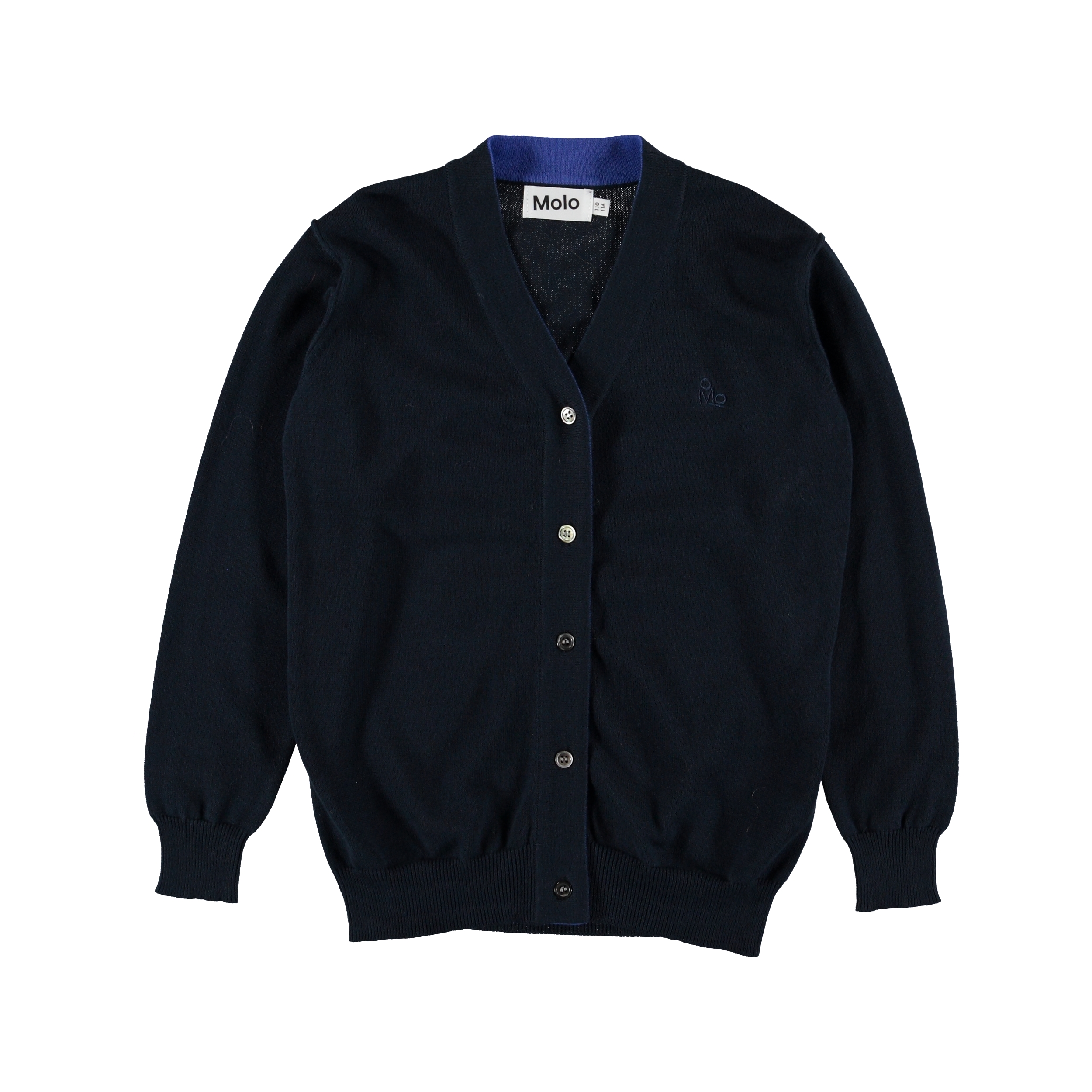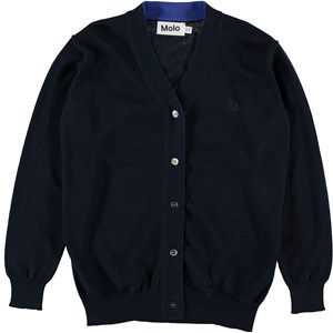 Basel är en långärmad, mörkblå cardigan i finstickad bomull med ribb vid hals, ärmslut och nederkant. Cardiganen har diskret Molo broderi på vänstra bröstet.
