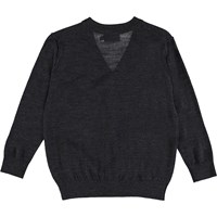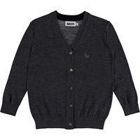 Långärmad, grå cardigan i finstickad ull med ribbad mudd i hals, ärmslut och nederkant. Cardiganen har diskret Molo broderi på vänster bröst.