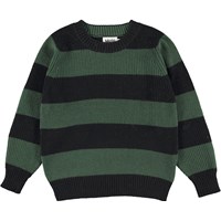 Bosse är en grön- och blårandig stickad bomullströja. Tröjan har ribbkant vid hals, krage, ärmslut och nertill.