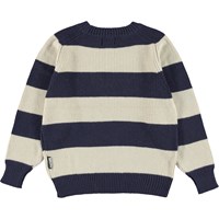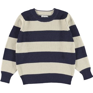 Bosse är en vit- och blårandig stickad bomullströja. Tröjan har ribbkant vid hals, krage, ärmslut och nertill.