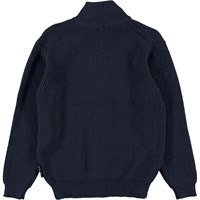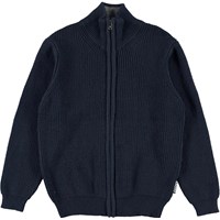 Boyd är en blå stickad tröja med hög hals och dragkedja framtill.