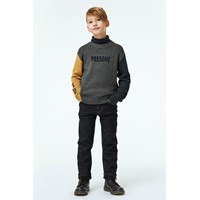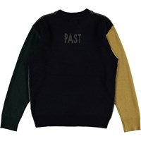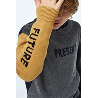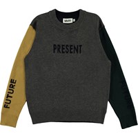 Buster är en blockfärgad stickad tröja med grå framsida samt gula och gröna ärmar. Den stickade tröjan har också text på ärmarna och framsidan där det står “Future” och “Present”.