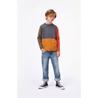 Buzz är en stcikad tröja med färgblock i rött, grönt, gult och grått. Tröjan har en rund hals och ribbade kanter.