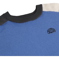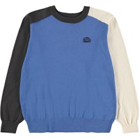 Blå stickad tröja i mjuk, ekologisk bomull med rund hals och UNITY-logotyp broderad på bröstet. Tröjan har en blå framsida med kontrastärmar i svart och off-white, vilket ger ett modernt och lekfullt uttryck. Den har ribbade kanter vid halsen, ärmarna och nederkanten för att säkerställa en bra passform och för att göra den bekväm att röra sig i.