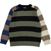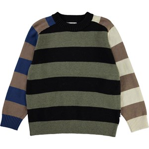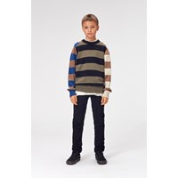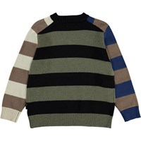 Buzzy är en stickad tröja i bomullsmix med breda dämpade och multifärgade ränder. Byzzy ribbkant vid hals ärmslut och höfter.