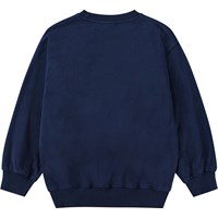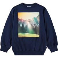 Mörkblå sweatshirt i ekologisk bomull med en borstad insida, vilket gör den mjuk och varm att ha på. Sweatshirten har en lös passform, långa ärmar med låga axelsömmar, en rund hals och ribbade kanter. Trycket visar ett UFO som landar på en glänta i skogen, med berg i bakgrunden.