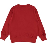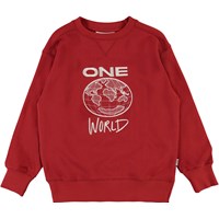 Mann är en röd tröja med ett tryck av världen och texten "One World". Tröjan har en rund hals och muddar i nederst på tröjan samt vid ärmslut.