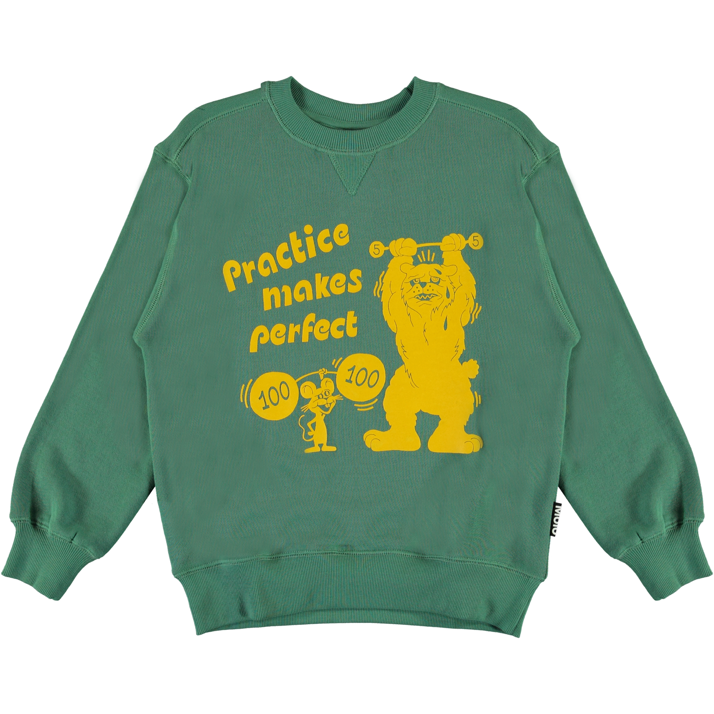 Allt handlar om att öva och att “övning ger färdighet”. Se själv hur den starka musen lyfter flera kilo på sweatshirten Mann. Sweatshirten är grön med ett guldigt tryck.
