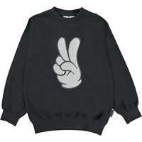 Mar är en svart sweatshirt med en en hand som gör ett peacetecken. Tröjan har ribbkant vid hals, nertill och vid ärmslut.