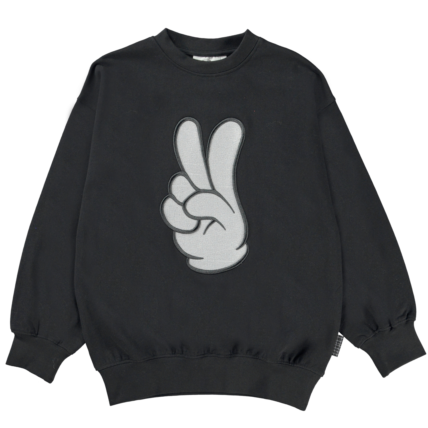 Mar är en svart sweatshirt med en en hand som gör ett peacetecken. Tröjan har ribbkant vid hals, nertill och vid ärmslut.