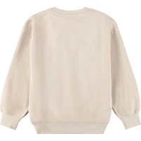 Beige sweatshirt i mjuk, ekologisk bomull med rund hals och ribbade kanter vid ärmarna, halsen och nederkanten. Sweatshirten har en lös, avslappnad passform med färgglada patchbroderier.