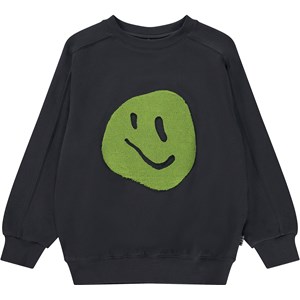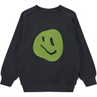 Svart sweatshirt med grönt mönster. På denna tröja ses en smiley i en förvrängd version, som sticker ut från tröjan och känns rolig när man drar handen över. Denna sweatshirt är tillverkad i 100% bomull, har rund hals med ribbkant, ribbkant vid höfter och ärmar och en lös passform.