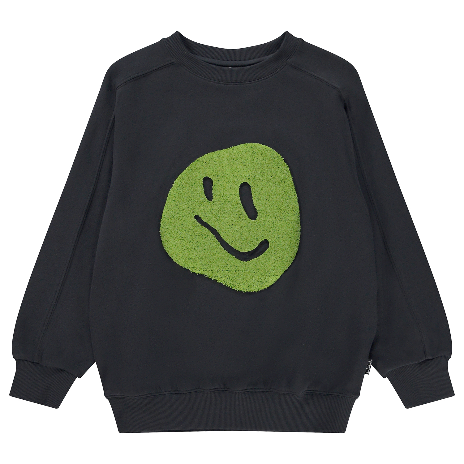 Svart sweatshirt med grönt mönster. På denna tröja ses en smiley i en förvrängd version, som sticker ut från tröjan och känns rolig när man drar handen över. Denna sweatshirt är tillverkad i 100% bomull, har rund hals med ribbkant, ribbkant vid höfter och ärmar och en lös passform.