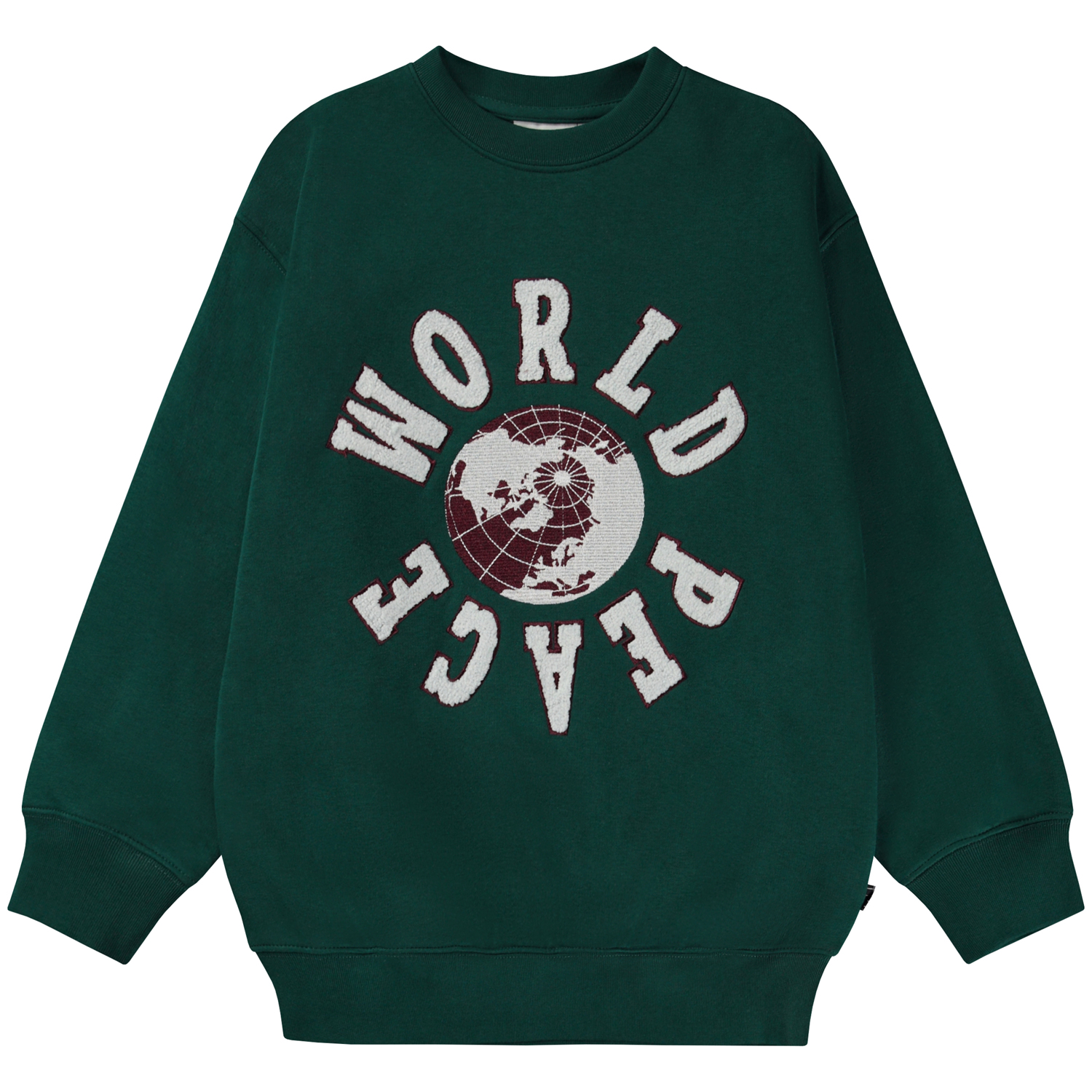 Mörkgrön sweatshirt med stort broderi framtill. Det vita och vinröda broderiet föreställer ett jordklot och förmedlar budskapet om "World Peace". Denna sweatshirt är tillverkad i 100% bomull, har rund hals med ribbkant, ribbkant vid höfter och ärmar och en lös passform. Matcha ä
