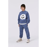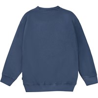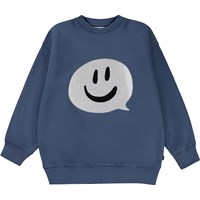 Blå sweatshirt med stort broderi framtill. Det vita och svarta broderiet är en stor pratbubbla som säger roliga saker. Denna sweatshirt är tillverkad i 100% bomull, har rund hals med ribbkant, ribbkant vid höfter och ärmar och en lös passform. Matcha ä