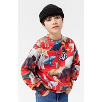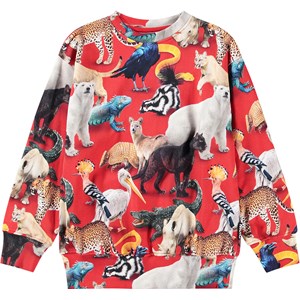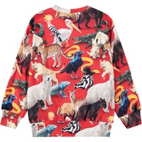 Mörkgrön sweatshirt i ekologisk bomull med en rund hals, ribbstickade muddar och nederkant. Sweatshirten har en normal passform och ett mönster med olika djur över hela. Tröjans insida är borstad, vilket gör den mjuk och varm att ha på.