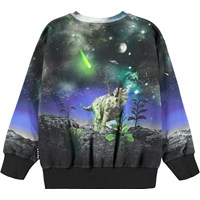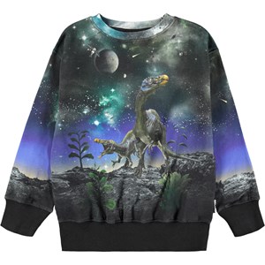 Mörk sweatshirt i mjuk ekologisk bomull med ribbade kanter runt halsen, ärmsluten och midjan. Sweatshirten har en normal passform och ett mönster av en dinosaurie och en vacker himmel.