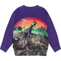 Lila sweatshirt i ekologisk bomull med en rund hals, ribbstickade muddar och nederkant. Sweatshirten har en normal passform och en tryckt bild på fram- och baksidan. Trycket visar tre dinosaurier som leker kurragömma med ett UFO. Tröjan har en borstad insida, vilket gör den mjuk och varm att ha på.