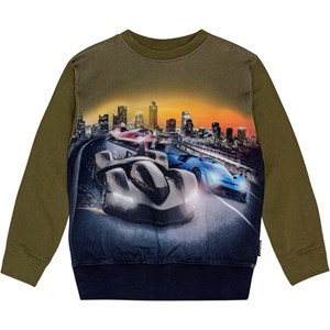 Armégrön sweatshirt i ekologisk bomull med rund hals, ribbstickade muddar och nederkant. Sweatshirten har en normal passform och en tryckt bild på fram- och baksidan. Trycket visar snabba racerbilar som tävlar, med en stadssiluett i bakgrunden. Tröjan har en borstad insida, vilket gör den mjuk och varm att ha på.