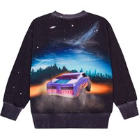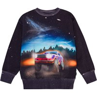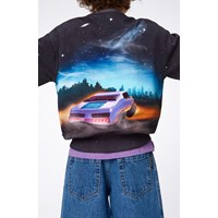 Svart ekologisk sweatshirt med färgrikt mönster. Här ses en vild och snabb bil med eldlågor längs sidan och stora däck. Baktill kan du se bilen bakifrån. Tröjan har en normal passform, rund hals med ribbkant och ribbkant vid handleder och höfter.