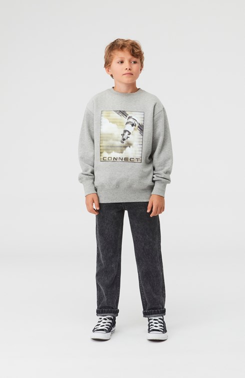 Mattis är en grå tröja med ett tryck av satelliter framtill. Kombinera tröjan med matchande byxor.