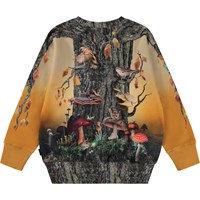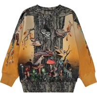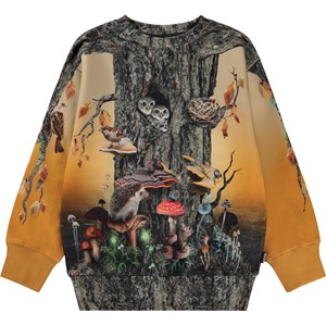 Orange och brun sweatshirt med trädstammar. I detta mönster kan man vara ett med naturen och leva sig in i att vara antingen en växt eller ett djur. Trädstammen står tryggt och säkert rotad med skogens djur, växter och svampar som inneboende. Ärmarna är grenar som både kan omfamna världen och sträcka sig mot himlen. Denna tröja är tillverkad i 100% bomull, har rund hals med ribbkant, ribbkanter vid höfter och ärmar samt en normal passform. Matcha denna tröja med byxorna Am i mönstret "Tree Life Below" för det perfekta setet.