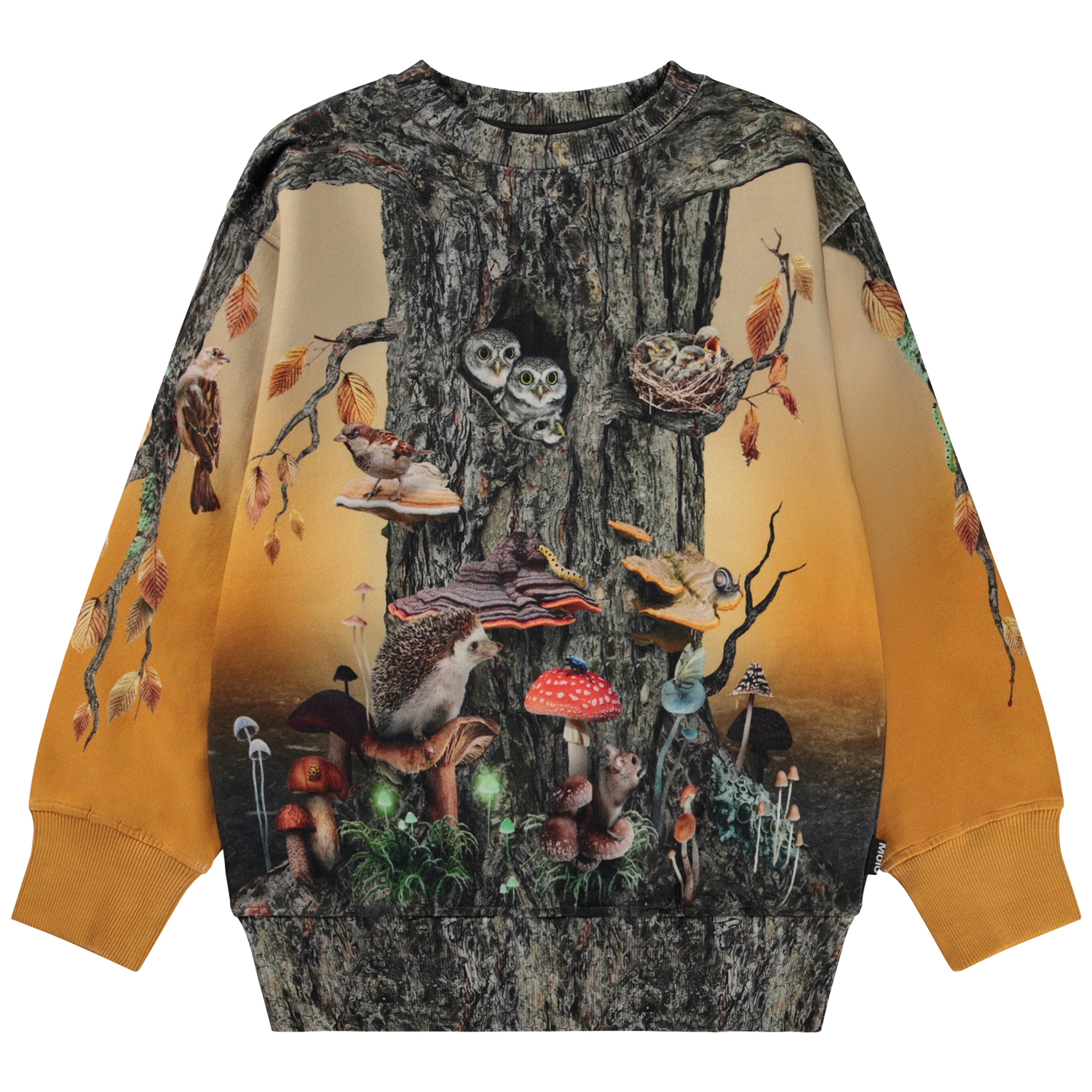 Orange och brun sweatshirt med trädstammar. I detta mönster kan man vara ett med naturen och leva sig in i att vara antingen en växt eller ett djur. Trädstammen står tryggt och säkert rotad med skogens djur, växter och svampar som inneboende. Ärmarna är grenar som både kan omfamna världen och sträcka sig mot himlen. Denna tröja är tillverkad i 100% bomull, har rund hals med ribbkant, ribbkanter vid höfter och ärmar samt en normal passform. Matcha denna tröja med byxorna Am i mönstret "Tree Life Below" för det perfekta setet.