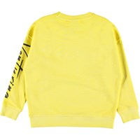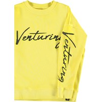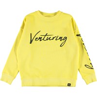 Max är en gul sweatshirt med texten 'Venturing' både fram och på vänstra ärmen.
