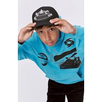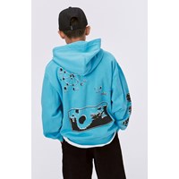 Turkosblå hoodie med grafiskt mönster. Mönstret består av olika rymdinspirerade element som t.ex. satelliter, månens faser och solförmörkelse. Mönstret får ett grafiskt uttryck med ikoner, text och grafiska foton i 3 toner. Denna hoodie är tillverkar i 100% bomull, har dragkedja, känguruficka, ribbkant vid ärmslut, höfter och en lös passform.