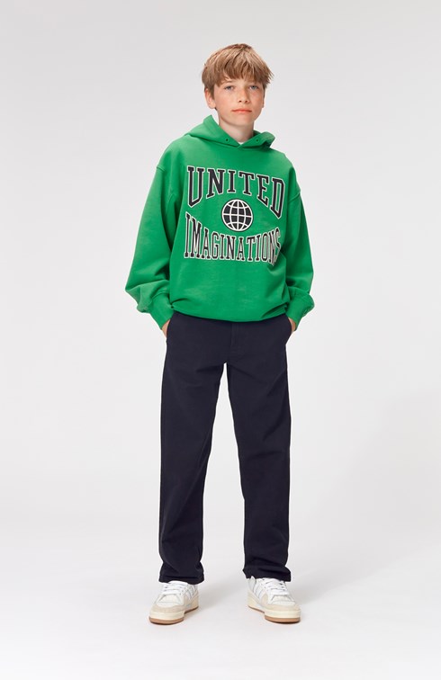 Maxx är en grön sweatshirt hoodie med texten "United Imaginations"på magen. Maxx har ribbkant vid ärmslut och höfter.