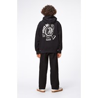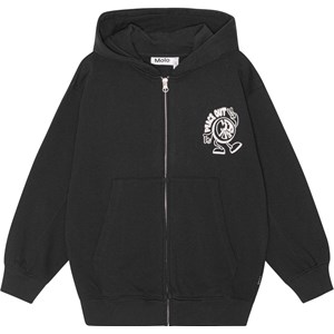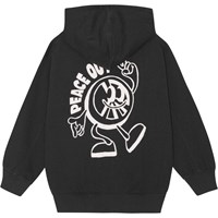 Mazz är en svart hoodie med dragkedja och vitt mönster fram-och baktill, i en mjuk bomull/polyester kvalitet. Mönstret är en handritad comic-figur som sprider budskapet om "Peace Out". Svart mönster på ryggen och litet framtill på bröstet. Denna hoodie har kängurufickam ribbkant vid ärmar och höften och en lös passform. Matcha denna hoodie med byxorna, Allen, i samma förg för det perfekta setet.