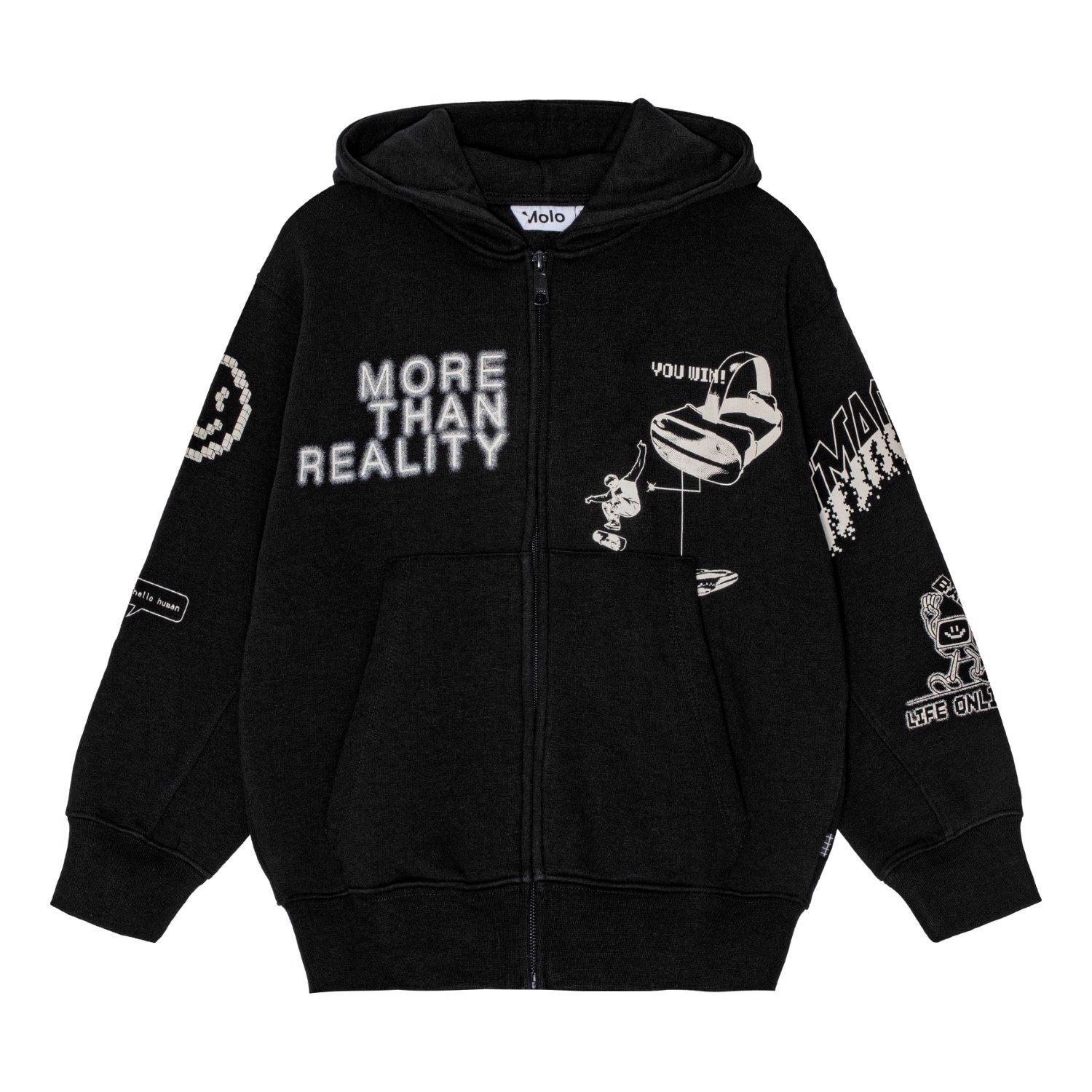Svart och vit hoodie i ekologisk bomull med dragkedja, huva, känguruficka och ribbstickade muddar och nederkant. Hoodien har en lös passform och ett mönster över hela plagget. Mönstret är inspirerat av element från datorspel och den virtuella världen, med vitt på svart.