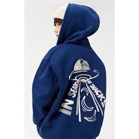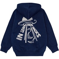 Mörkblå hoodie i ekologisk bomull med dragkedja, huva, känguruficka, ribbade kanter och en borstad insida som gör den mjuk och varm att ha på. Tröjan har en lös passform och har en tryckt teckning av ett UFO på bröstet och ryggen, som letar efter snacks.