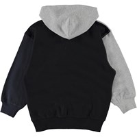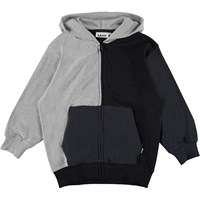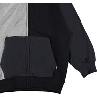 Me är en huvtröja i svart, grått och blått. Blusen har en känguruficka på framsidan samt dragkedja.