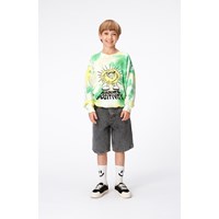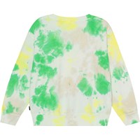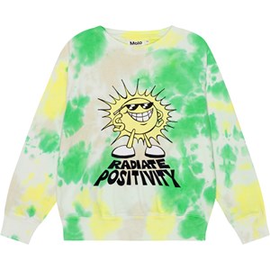 Ekologisk sweatshirt med gult/grönt tie-dye och mönster framtill. Mönstret är ett comic-style mönster med en leende självsäker sol som sprider budskapet "RadiatePositivity". Tröjan har en normal passform, rund hals med ribbkant och ribbkant vid handleder och höften. Notera att allt vårt tie-dye är handgjort och kan därför variera från plagg till plagg.