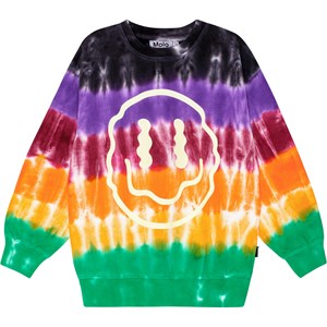 Multifärgad sweatshirt i tie-dye och ekologisk bomull med rund hals, ribbstickad kant i midjan och ärmsluten. Sweatshirten har en normal passform och en borstad insida, vilket gör den mjuk och varm att ha på. Placerat tryck på framsidan av en stor smiley i vitt, vilket skapar en glitch-effekt.