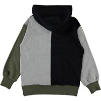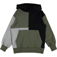 Meqo är en huvtröja i svart, grå och kakigrön. Huvtröjan har en känguruficka på framsidan.