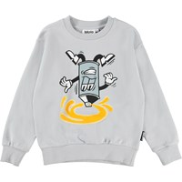 Mik är en gråblå sweatshirt med en sprayflaska som breakdansar.