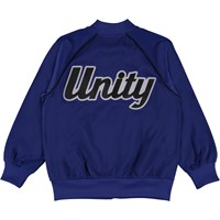 Mikiyaki är en blå sportiga jacka med texten 'Unity' på vänstra bröstet och ryggen. Jackan har dragkedja, samt fickor framtill.