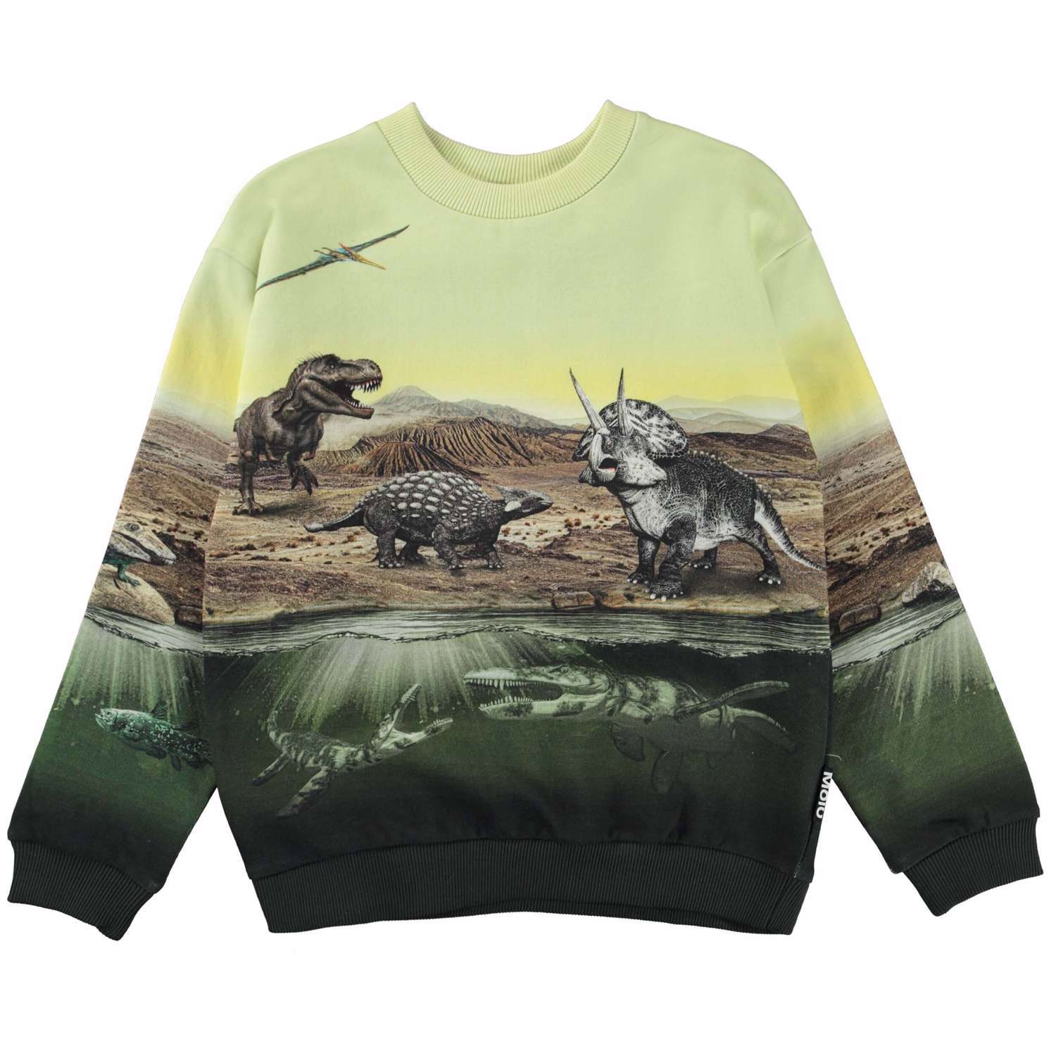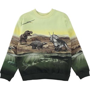 På sweatshirten Miksi i mönstret "Dino Earth" skickas du tillbaka till den gången dinosaurierna regerade på jorden, både på land, i vattnetoch i luften. Miksi har ribbkant i halv, vid ärmslut och höfter.