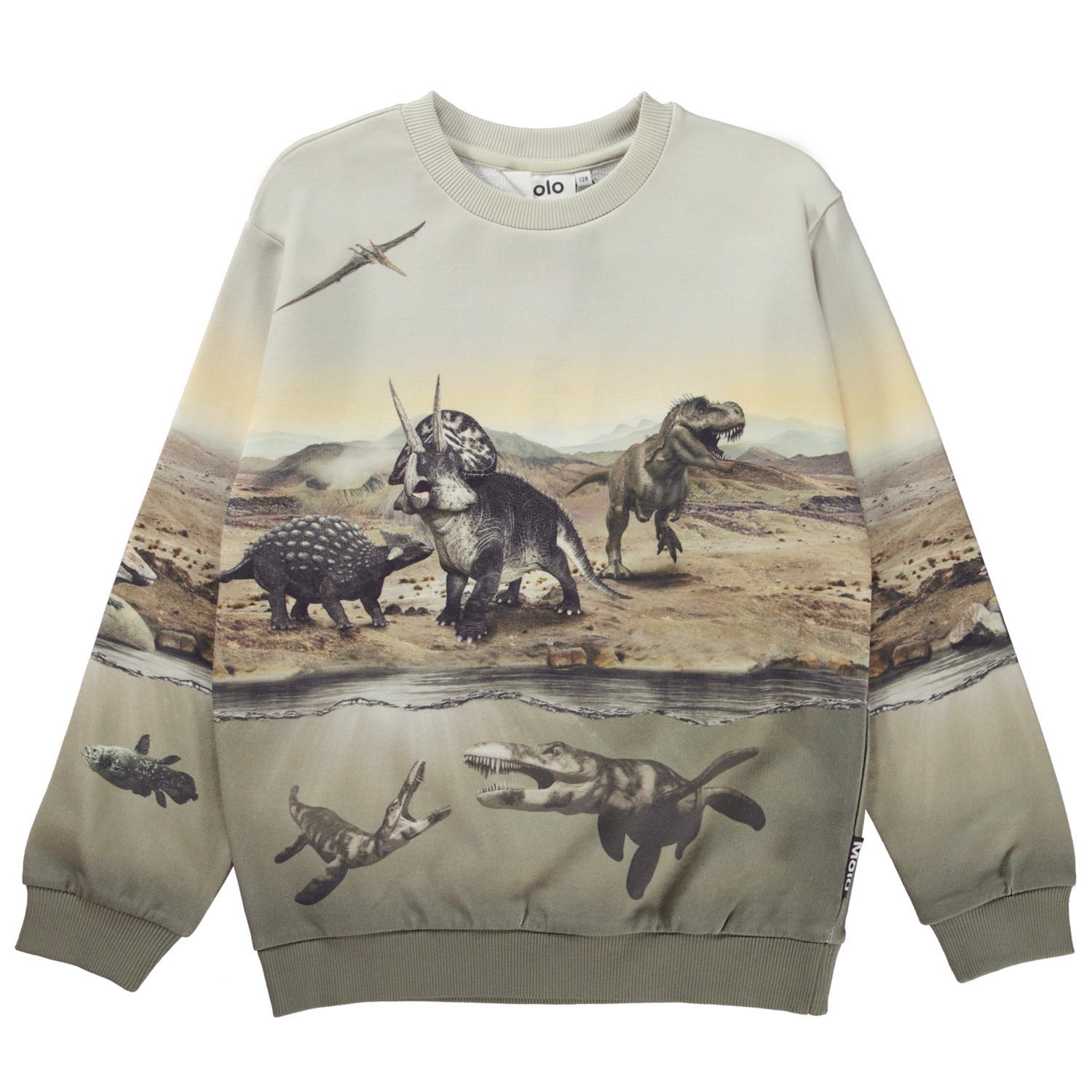 Miksi är en beige sweatshirt med olika dinosaurie, som lever både på land och under vatten. Tröjan har ribbkant vid hals, nertill och vid ärmslut.