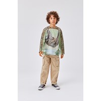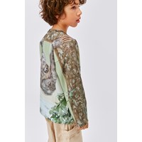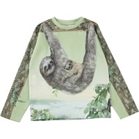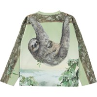 Milou är en grön tröja med en sengångare som, tillsammans med sin unge, hänger påen gren och njuter av livet. Tröjan har ribbkant vid hals, nertill och ärmslut.