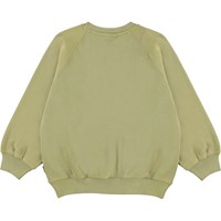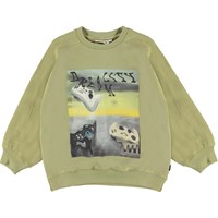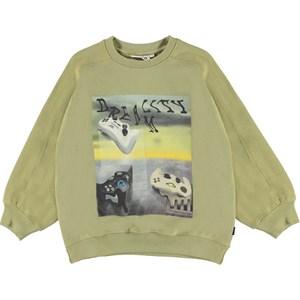 Mir är en blekt grön sweatshirt med mönstret "Melted Consoles". Mir har raglansnitt och har ribbkant vid hals handled och höft.