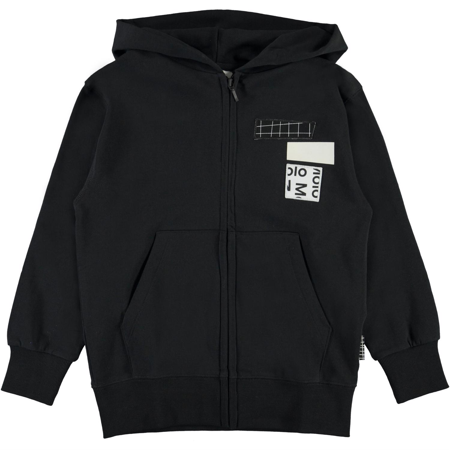 Mok är en svart tröja med dragkedja, huva och olika Molo-märken på bröstet.